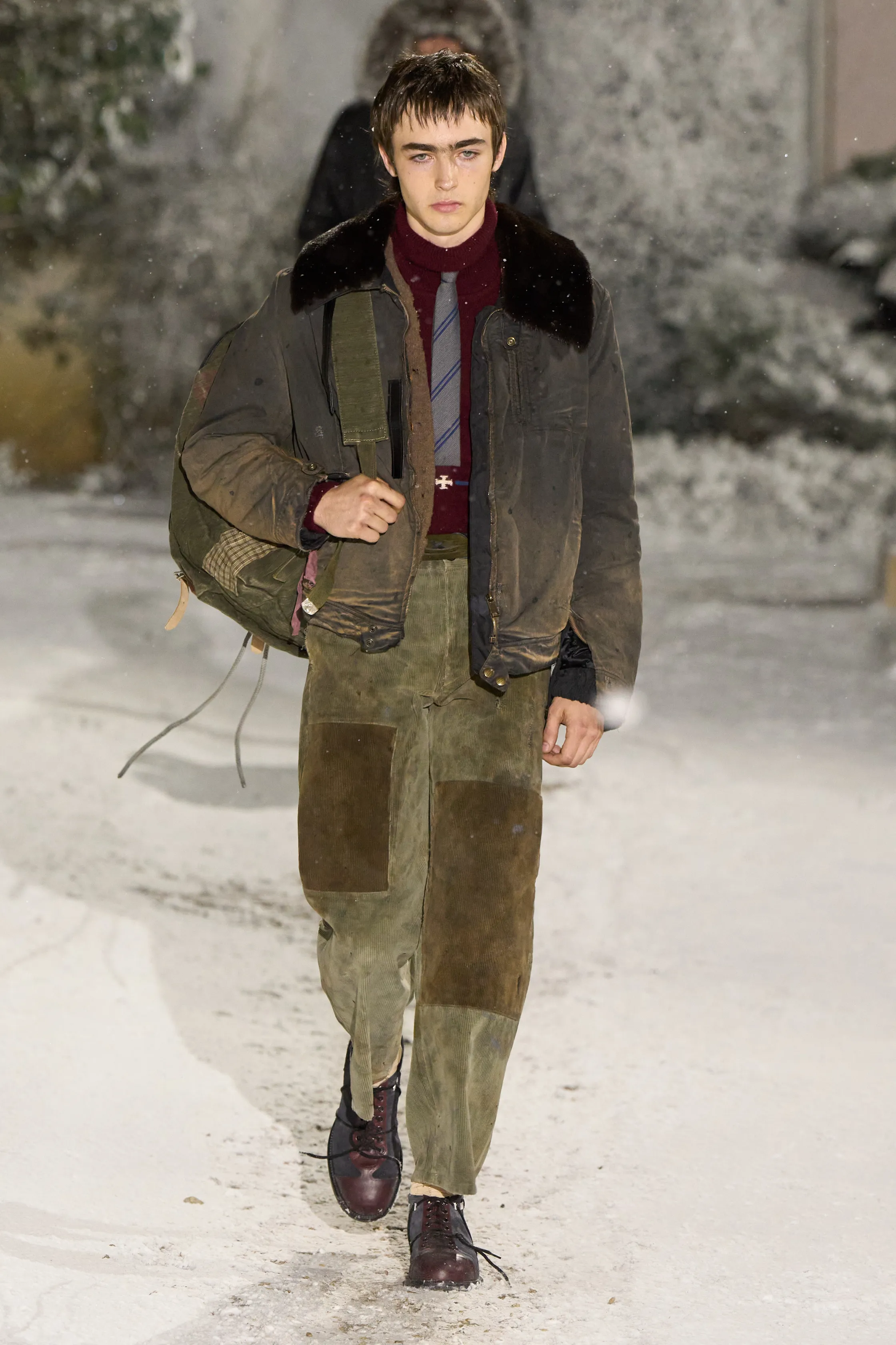 Throughout the collection, contradiction remained central. Severe tailoring met distressed textures. Rich materials were paired with casual elements like denim. Even the snowy setting amplified the sense that these garments belonged to a world suspended somewhere between fantasy and ruin.